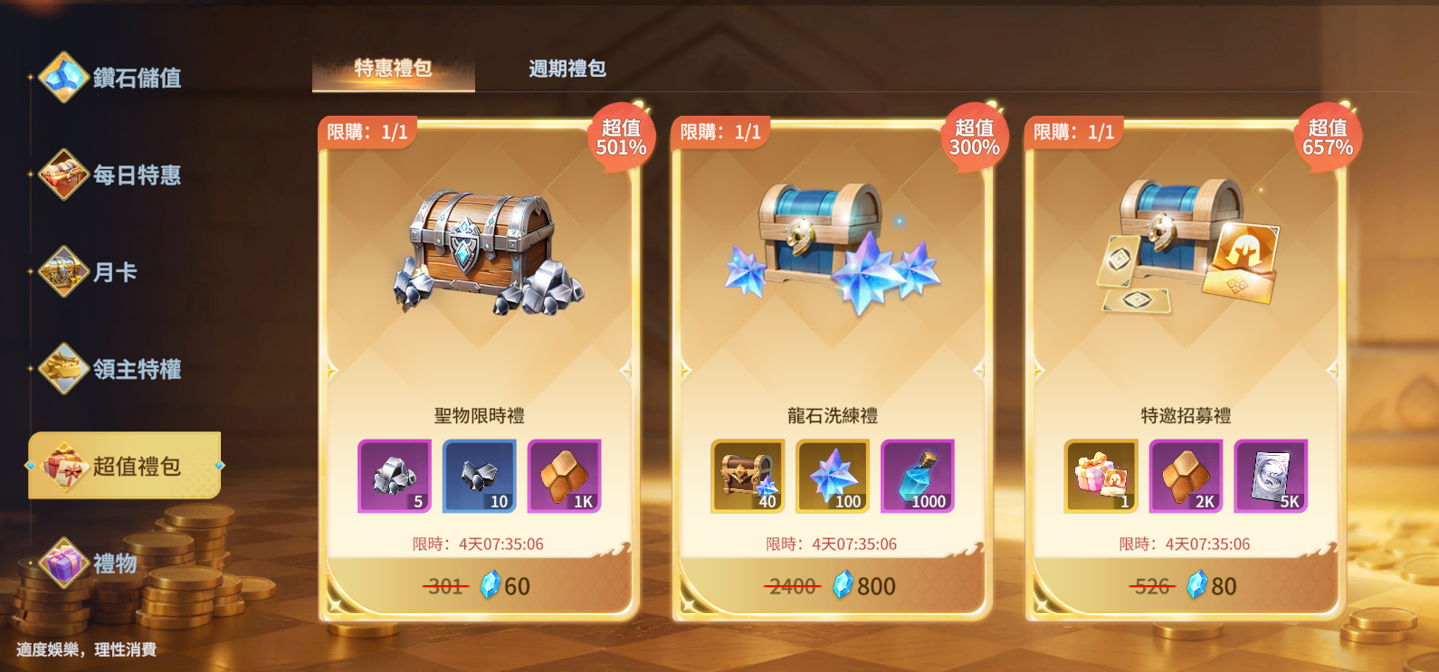 活動說明:活動期間,商城將上線聖物限時禮、龍石洗禮、特邀招募禮等各種超值特惠禮包。