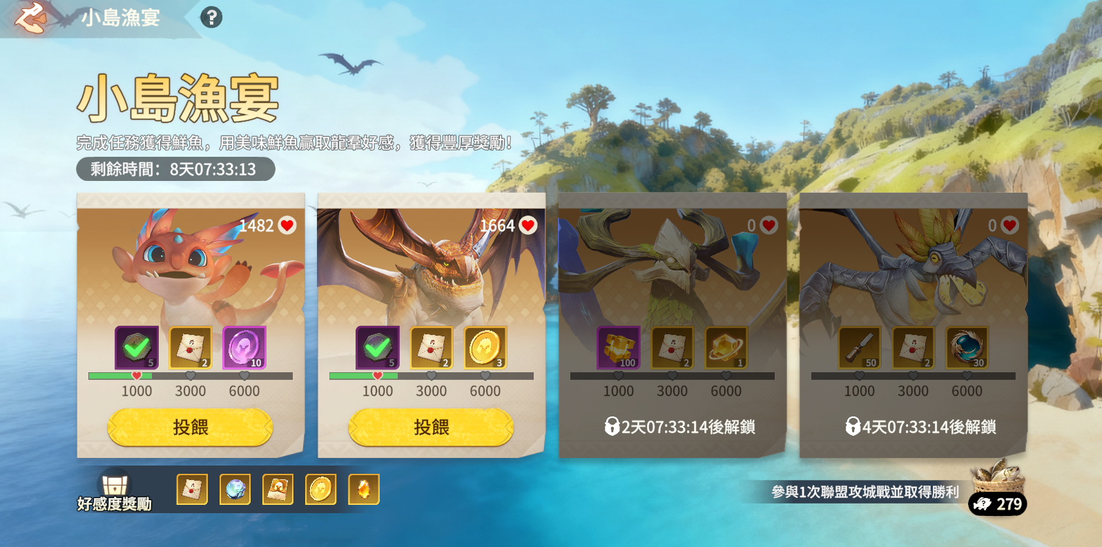 活動說明:完成任務獲得鮮魚,用美味鮮魚投餵龍群獲取好感度,獲得豐厚獎勵!個人總好感度到達指定階段時,可獲得更多個人好感度獎勵。