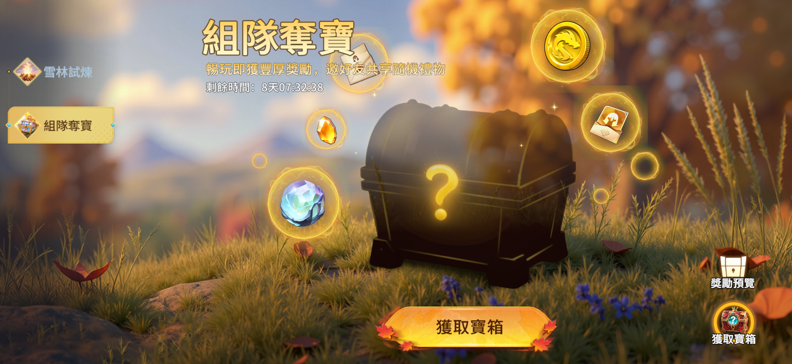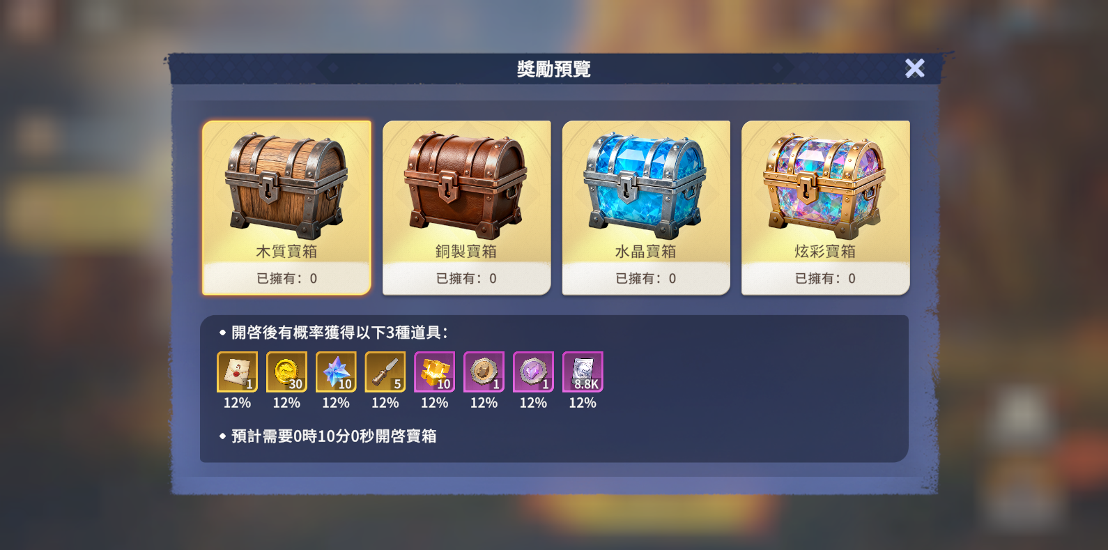 活動簡介:完成每日任務可獲得一個隨機品質的寶箱(木質、銅質、水晶、炫彩),並可透過消耗鑽石進一步客製化提升該寶箱的品質。每個寶箱開啟需等待一定時間,邀請好友組隊進行寶箱開啟則縮短等待時長,同時領主自己和好友均可獲得寶箱內獎勵。根據寶箱品質,開啟後可獲得英雄邀請函、龍幣、秘焰晶核等不同價值的稀有道具。