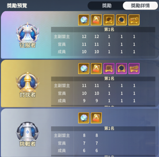 前十名盟主及成員可獲得以下獎勵:秘焰晶核、甄選邀請函。排名越高且職位越高,獲得的秘焰晶核和甄選邀請函數量越多。