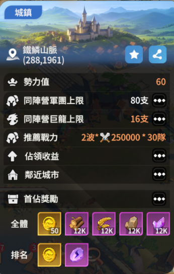 全新地圖,全新旅程!所有城鎮均可重新佔領,並可獲得首戰獎勵,勢力值越高的城鎮獎勵越多!